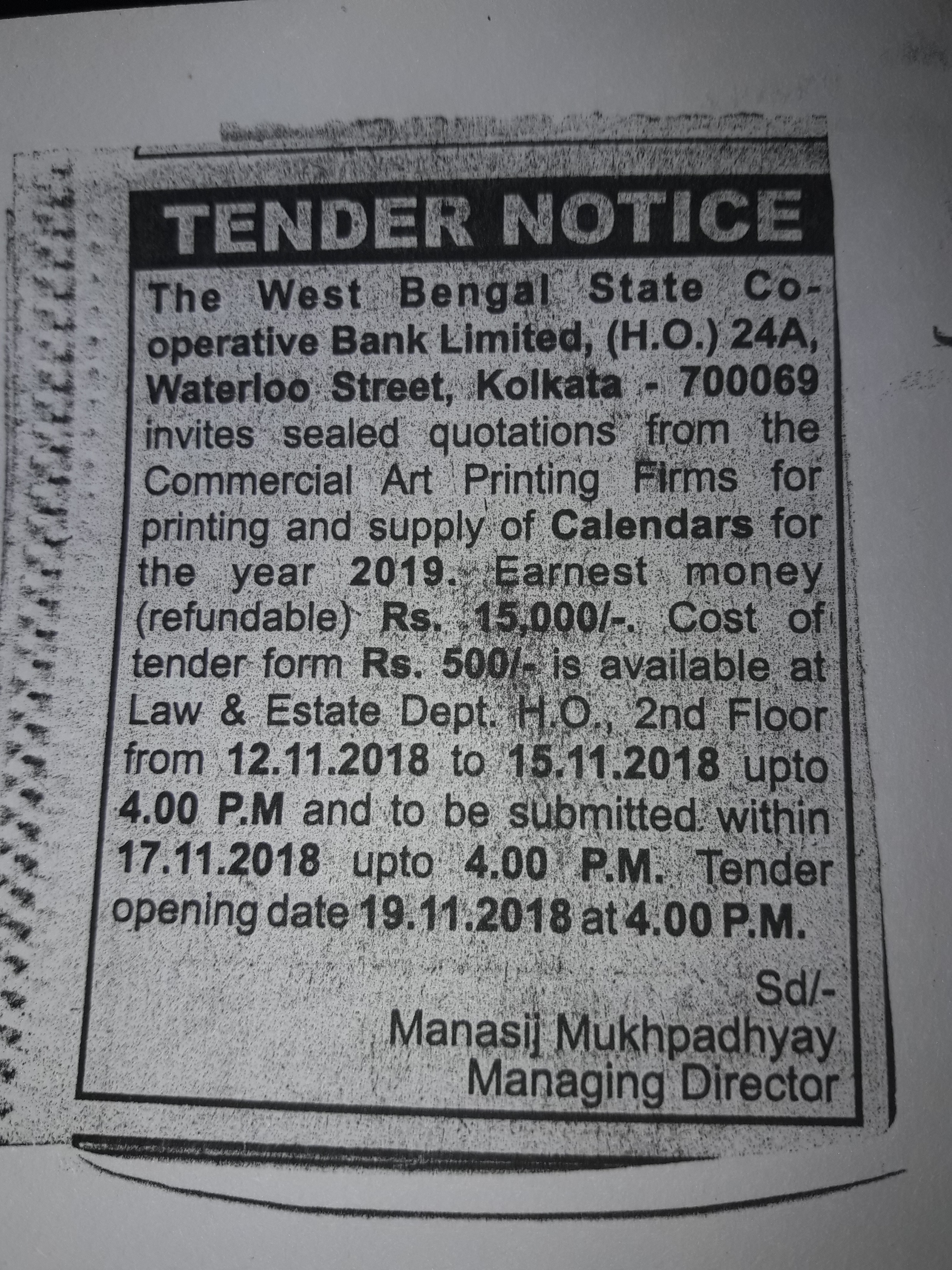 | 93 | N/A | Tender Notice for Calendar-2019 for The WBSCB Ltd | Paper Tender | 2018-11-12 | 2018-11-17 | ||