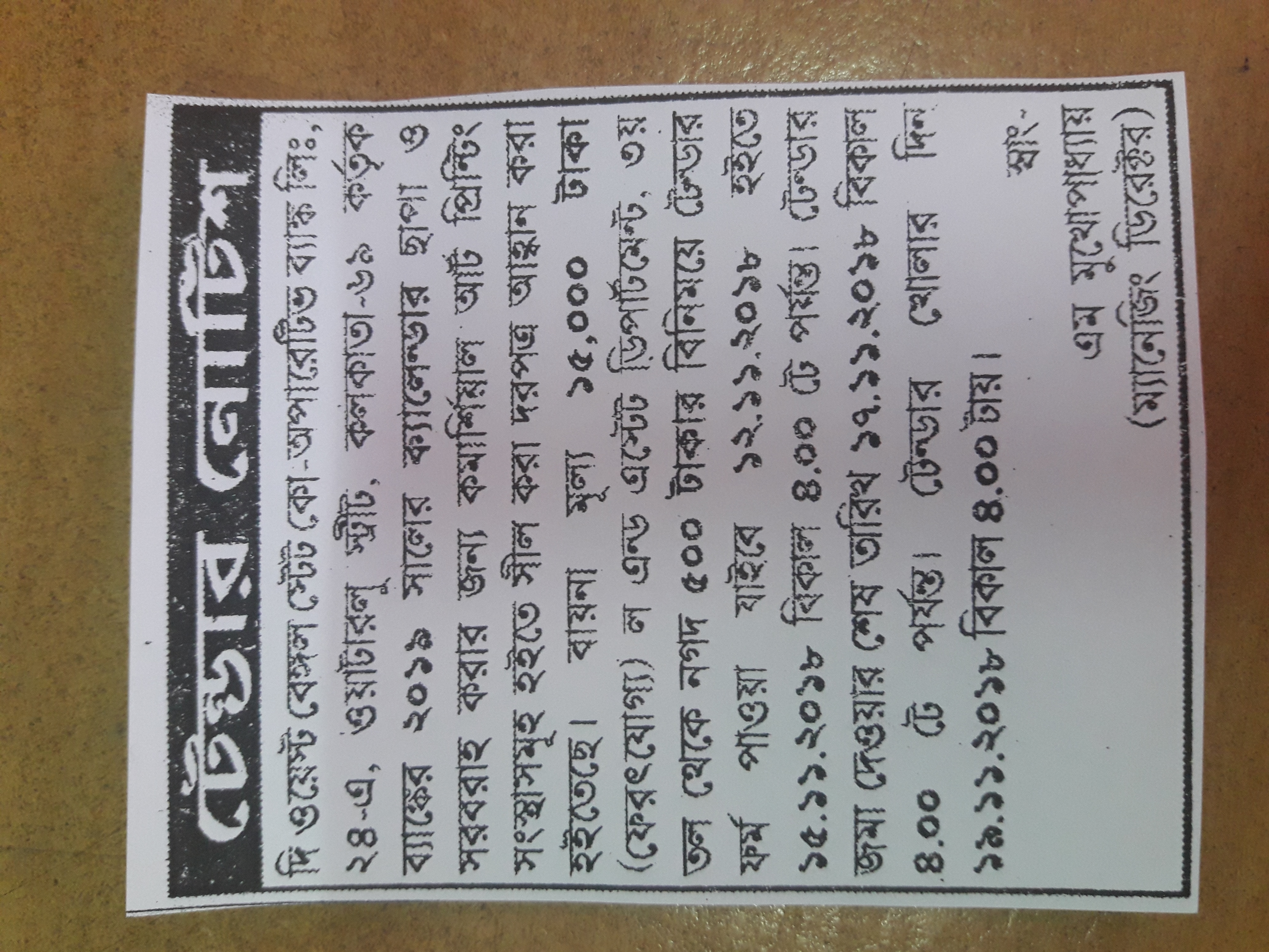 | 1 | HO/MD/NIQ/1905/2025-26 | NIQ are invited on behalf of The West Bengal State Co-operative Bank Ltd from the firms dealing with scrap material to sell out damaged / waste Steel Furnitures, Photo copier machine, Glow Sign Boards, False Roof material, etc. at Head office of the bank | Paper Tender | 2025-11-04 | 2025-11-11 | ||